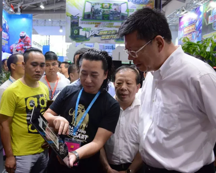 開幕式一結(jié)束,中山市各個領(lǐng)導(dǎo)就在中國文化娛樂行業(yè)協(xié)會執(zhí)行會長劉金華、中山市文化廣電新聞出版局局長羅建華、廣東游戲游藝文化產(chǎn)業(yè)城總裁葉威棠等的帶領(lǐng)下移步前往展廳參觀。