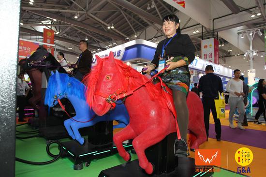 如金馬科技的GJT-60A觀景塔、ZB-72A轉(zhuǎn)轉(zhuǎn)杯、3D互動(dòng)軌道車;世宇的動(dòng)感戰(zhàn)機(jī)、怪獸獵人、一球成名、糖果扭扭蛋;華立的瘋狂兔子、頭文字D ZERO、巨獸浩劫2幸運(yùn)光圈;大新的裝配式智能泳池;通利動(dòng)漫:粉紅格格禮品機(jī),海綿寶寶游樂設(shè)備;牧童的叢林水寨、皮筏滑梯、牧童繽紛水屋,日東的繽紛射球、旋風(fēng)摩托;智跑的中型懸掛過山車、彈射過山車;金滿鴻的樂吧車、戰(zhàn)火金剛、幻影摩托;燁睿的一推天下、YOYO派對;兩只老虎的翻滾車、倉鼠球……